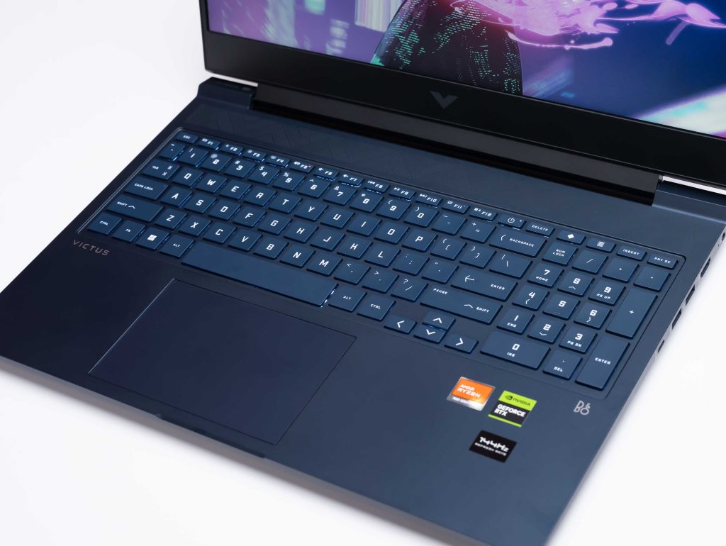 Khác với dòng Omen, HP Victus 16 được trang bị bàn phím fullsize với đầy đủ cụm phím số, mang lại sự tiện lợi khi nhập liệu, làm việc văn phòng hay chiến game. Trải nghiệm gõ phím khá ổn với hành trình phím vừa phải, độ phản hồi tốt, đủ để làm hài lòng cả game thủ lẫn người dùng phổ thông. Tuy nhiên, thay vì LED RGB như nhiều laptop gaming khác, HP Victus 16 chỉ được trang bị đèn nền đơn sắc, hạn chế đôi chút về mặt thẩm mỹ – nhưng đổi lại, độ sáng vừa đủ và dễ quan sát trong mọi điều kiện.