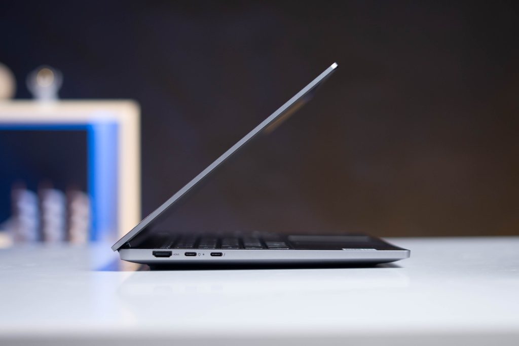Bên cạnh đó, thiết kế chống trượt được hoàn thiện với các chân đế cao su, giúp laptop vững vàng trên bàn làm việc mà không sợ trượt. Trọng lượng gần 1.46kg của máy không phải là một điểm yếu khi nó đi kèm với màn hình lớn và không gian làm việc rộng rãi. Tuy không có quá nhiều sự khác biệt so với các phiên bản trước đó nhưng thiết kế của Lenovo IdeaPad 5 Pro 14 (XiaoXin Pro 14) vẫn rất nổi bật so với các sản phẩm cùng tầm giá.